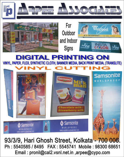 | BENZAR ADS (For vinyl glow sign board, metal dealer board, wall painting, banner, teen plate, brand shop, in-shop sales promotion, sales promotion by van operation, rural activities & other out door advertising jobs in all over eastern India) 14/1/6, Sitanath Bose Lane Salkia, Howrah - 711 106 PH : 6656711 / 6656231 Mobile : 98310 41196 EMAIL : benzar@cypo.com |